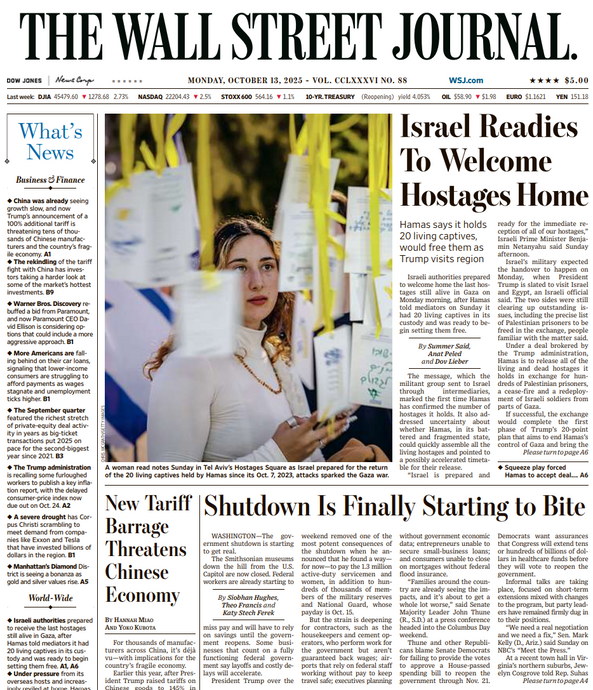 • Israel Readies To Welcome Hostages Home | The Wall Street Journal -- Mon., October 13, 2025