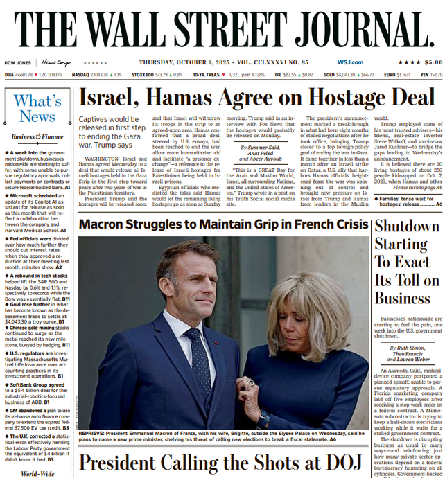 Israel, Hamas Agree on Hostage Deal | The Wall Street Journal -- Thu., October 09, 2025