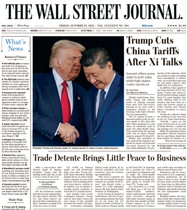 Trump Cuts China Tariffs After Xi Talks | The Wall Street Journal -- Fri., October 31, 2025![]()  - Regular price