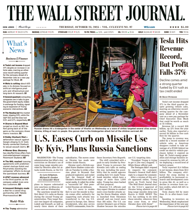 Full newsprint issue of the Eastern Edition of The Wall Street Journal as published on Thursday, October 23, 2025.
