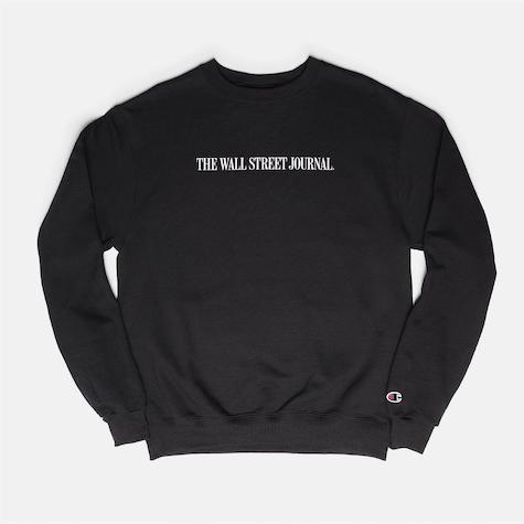 This black Champion Eco fleece sweatshirt features The Wall Street Journal classic typeface in white screen print with raised ink. The famous Champion C embroidered logo sits near the left cuff.